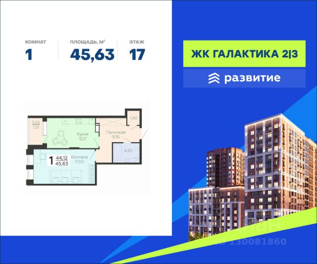 В продаже квартира площадью 60.43 кв. м с отделкой white box. Квартира расположена на 1 этаже 18 этажного дома, в жилом комплексе комфорт-класса "Галактика 2|3". "Галактика 2|3" - это современный квартал нового поколения, где есть все городские удобства, дополненные локациями для активного отдыха, а главное -близостью к природе. Здесь вас будут ждать уютные квартиры с панорамными балконами и большие дворы с детскими площадками. Проект реализован федеральным застройщиком "Развитие" - один из крупнейших девелоперов Воронежской области, занимающий лидирующую позицию среди застройщиков по объему текущего строительства. Расположение Пешком: - 5 мин. до улицы Независимости; - 5 мин. до остановки "СКС Лада"; - 15 мин. до Северного леса; - 20 мин. до ТРК "Арена". На автомобиле: - 5 мин. до трассы на ул. Антонова-Овсеенко; - 10 мин. до Московского проспекта; - 15 мин. до Центрального парка; - 20 мин. до набережной Максима Горького. Благоустройство - двор, разделенный на функциональные зоны; - ландшафтное озеленение; - тихие уголки для отдыха; - скамьи и садовая мебель; - каменные дорожки для прогулок; - велосипедные и беговые дорожки; - большой игровой кластер для подростков; - активная площадка для малышей; - workout-тренажеры; - безопасное мягкое покрытие; - освещение в темное время суток; - большая открытая парковка; - кладовые для хранения велосипедов или лыж; - коммерческие офисы с ресторанами, магазинами и кафе. Окружение - жизнь по соседству с природой: Северный лес, озёра Бычок, Северск и Круглое, Фигурная роща, река Дон; - спортивные объекты: спорткомплекс "Арена Север", стадионы "Воронеж-Ринг", "Мир футбола", "Атлант", конный клуб "Старица", "Олимпик", ТРЦ Сити-парк "ГРАД"; - культурный отдых: музей ВДВ в парке Победы, Археологический музей, культурный центр "Северный"; - ТРЦ "Арена", "Московский проспект", школы, детские сады, супермаркеты.