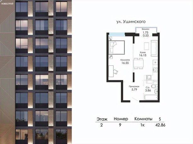 Продаётся 1-комнатная квартира в строящемся доме (Дом 1), срок сдачи: II-кв. 2026, общей площадью 42.86 кв.м., на 9 этаже. Новый жилой комплекс "Glinki парк" от группы компаний "Новострой" расположен по адресу: г. Воронеж, по ул. Ломоносова.