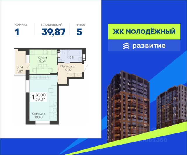 В продаже квартира площадью 39.87 кв. м с черновой отделкой. Квартира расположена на 5 этаже 19 этажного дома, в жилом комплексе "Молодежный" (застройщик - ГК "Развитие"). ЖК "Молодежный" - лучший жилой комплекс в юго-западной части Воронежа. Семейный квартал удачно расположен в окружении рек и озёр, и при этом имеет все условия для комфортного проживания. Хорошая транспортная доступность, эргономичные планировки, уютные дворы, продуманная архитектурная концепция и вся нужная инфраструктура. Расположение Пешком: - 8 мин. до ТЦ "Ермак"; - 9 мин. до автобусной остановки "Магазин"; - 15 мин. до пристани у реки Дон. На автомобиле: - 4 мин. до шоссе на Острогожской улице; - 5 мин. до Гремяченского моста; - 20 мин. до Ленинского района; - 25 мин. до центра города. Благоустройство - просторные входные группы; - современные лифты в каждом подъезде; - прогулочные бульвары и велодорожки; - лиственные и хвойные деревья во дворе; - большие игровые комплексы для детей; - малышам - качели, песочницы, горки; - фото-зона; - силовые и кардио-тренажеры; - турники для воркаута; - футбольная площадка; - просторный наземный паркинг; - кладовые помещения для габаритных вещей; - зона ритейла: пункты выдачи, продуктовые магазины, кафе, пекарни. Окружение - 6 лесопарковых зон: Малышевский, Долгий, Шиловский и Тавровский леса, лесной массив "Жировская дача", парк "Семейный"; - квартал в окружении воды: река Дон, Воронежское водохранилище, Шиловское озеро, Березовский затон; - 3 пляжа, зоопарк "Червленый Яр", смотровая площадка на холме с видом на Дон; - 2 школы, детский сад, поликлиника, торговые центры "Ермак" и "Магнит", досуговый клуб "Шилово" - все в шаговой доступности.