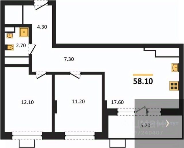 Квартира: 2 к 58,10 кв.м., 7 этаж в комплексе Ключи CLUB, 1 очередь, корп.1, сдача: 2кв. , этажей: 15, адрес Воронеж г., Содружества бул., д. 52 корп. 5, Застройщик: Новый код.