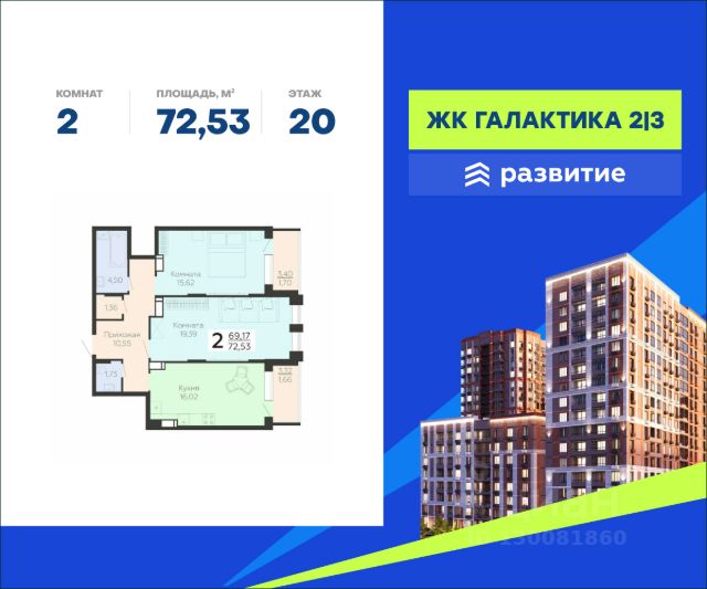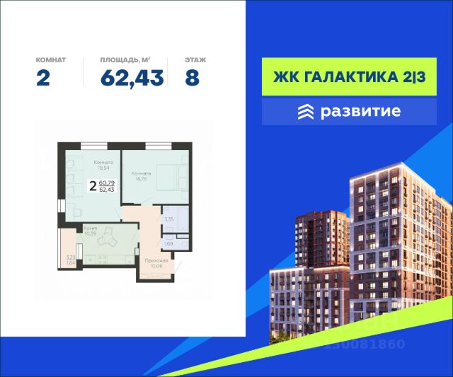 В продаже квартира площадью 60.43 кв. м с отделкой white box. Квартира расположена на 2 этаже 18 этажного дома, в жилом комплексе комфорт-класса "Галактика 2|3". "Галактика 2|3" - это современный квартал нового поколения, где есть все городские удобства, дополненные локациями для активного отдыха, а главное -близостью к природе. Здесь вас будут ждать уютные квартиры с панорамными балконами и большие дворы с детскими площадками. Проект реализован группой компаний "Развитие" - один из крупнейших девелоперов Воронежской области, занимающий лидирующую позицию среди застройщиков по объему текущего строительства. Расположение Пешком: - 5 мин. до улицы Независимости; - 5 мин. до остановки "СКС Лада"; - 15 мин. до Северного леса; - 20 мин. до ТРК "Арена". На автомобиле: - 5 мин. до трассы на ул. Антонова-Овсеенко; - 10 мин. до Московского проспекта; - 15 мин. до Центрального парка; - 20 мин. до набережной Максима Горького. Благоустройство - двор, разделенный на функциональные зоны; - ландшафтное озеленение; - тихие уголки для отдыха; - скамьи и садовая мебель; - каменные дорожки для прогулок; - велосипедные и беговые дорожки; - большой игровой кластер для подростков; - активная площадка для малышей; - workout-тренажеры; - безопасное мягкое покрытие; - освещение в темное время суток; - большая открытая парковка; - кладовые для хранения велосипедов или лыж; - коммерческие офисы с ресторанами, магазинами и кафе. Окружение - жизнь по соседству с природой: Северный лес, озёра Бычок, Северск и Круглое, Фигурная роща, река Дон; - спортивные объекты: спорткомплекс "Арена Север", стадионы "Воронеж-Ринг", "Мир футбола", "Атлант", конный клуб "Старица", "Олимпик", ТРЦ Сити-парк "ГРАД"; - культурный отдых: музей ВДВ в парке Победы, Археологический музей, культурный центр "Северный"; - ТРЦ "Арена", "Московский проспект", школы, детские сады, супермаркеты.