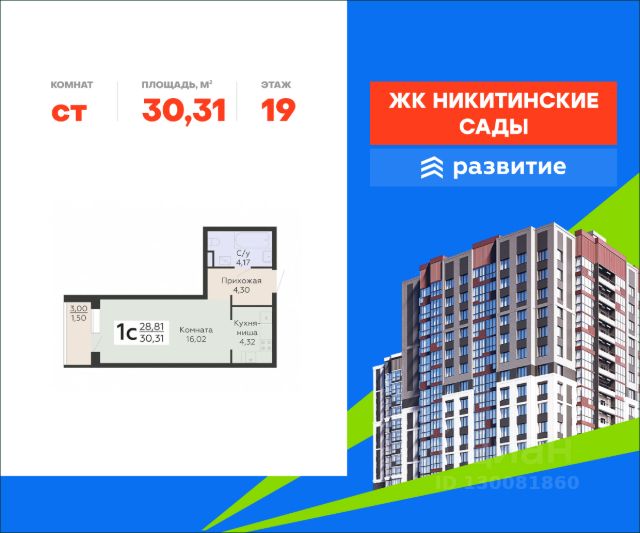 В продаже квартира площадью 30.31 кв. м с черновой отделкой. Квартира расположена на 19 этаже 20 этажного дома, в жилом комплексе комфорт-класса "Никитинские сады". "Никитинские сады" - это новое пространство, которое объединяет в себе современный внешний вид и атмосферу природного уюта. Жилой комплекс включает в себя 4 20-этажных корпуса, 1090 квартир различных планировок, множество общественных пространств для отдыха и собственную инфраструктуру. Наслаждайтесь всеми преимуществами города в окружении живописной природы! Расположение - 10 мин. пешком до остановки "улица Маршала Голикова"; - 5 мин. до бульвара Победы; - 9 мин. до ТРЦ "Арена"; - 20 мин. до ж/д станции "Березовая роща"; - 25 мин. до центра города; Благоустройство - несколько садов во дворе; - озеленение территории; - развивающие комплексы для малышей; - зоны для фотосессий; - скамьи по всему периметру; - прогулочные дорожки; - уличные тренажеры; - турники для воркаута; - мягкое покрытие на активных площадках; - оборудование из натуральных материалов; - освещение территории в вечерние часы; - просторный наземный паркинг; - кафе, магазины и бытовые сервисы на первых этажах. Окружение - природный отдых: Северный лес и лесопарк, пляж у реки Дон, озера Северск, Бычок, Круглое; - активный отдых: спорткомплекс "Арена Север", "Олимпик", футбольная школа и стадион, бассейн "Атлант", теннисный клуб "Спарта"; - культурный отдых: Музей почтового дела, КДЦ "Северный", храм Ксении Петербургской; - городской отдых: ТРЦ Сити-парк "Град" и "Московский проспект", ТРЦ "Арена", множество магазинов, кафе и студий красоты.