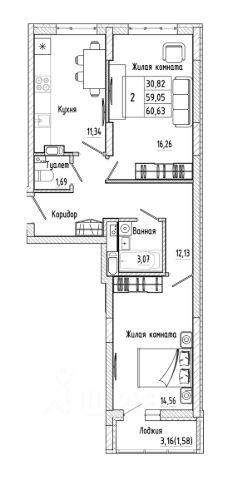 В продаже квартира площадью 68.86 кв. м с черновой отделкой. Квартира расположена на 6 этаже 13 этажного дома, в жилом комплексе комфорт-класса "Мармелад" (Федеральный застройщик - ГК "Развитие").