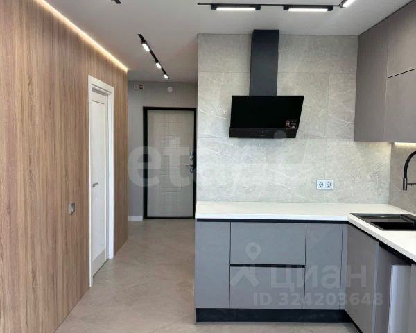 Потолок с теневым профилем и подсветкой, стены - декоративная штукатурка (отдельное фото), кухня с теневыми зазорами от пола до потолка, парящие базы.