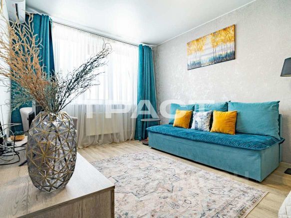 Жилая комната с большим видовым окном, широкий удобный подоконник столешница. Встроенный шкаф купе, с множеством полок.
