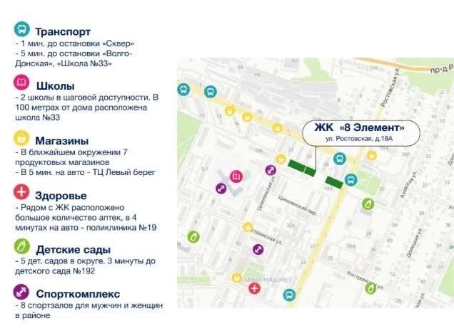 ЖК "8 Элемент" — современный комфорт и продуманное пространство для жизни Адрес: г. Воронеж, ул. Ростовская, д. 18А Класс жилья: комфорт Тип домов: монолитно-кирпичные, 15 этажей Срок сдачи: IV квартал 2025 года В Левобережном районе Воронежа продолжается строительство современного жилого комплекса "8 Элемент" от ГК "Проект Инвест". Это проект, в котором сочетаются уют, комфорт и внимание к деталям. Комплекс состоит из трёх очередей 15-этажных домов с современными фасадами и продуманными планировками. ЖК "8 Элемент" — это место, где продумано всё для удобной и гармоничной жизни: от архитектуры и благоустройства до инфраструктуры и доступности транспорта. Преимущества ЖК "8 Элемент": Современная архитектура и функциональные планировки. Комфортное окружение и продуманная внутренняя инфраструктура. Близость к основным транспортным магистралям. Развитый район с магазинами, школами и детсадами в шаговой доступности. Безопасная территория и современное благоустройство. Благоустройство территории: Детские и спортивные площадки с современным покрытием. Зоны отдыха, скамейки и пешеходные аллеи для прогулок. Газоны, цветники и зелёные насаждения из многолетних растений. Продуманное освещение и декоративные элементы ландшафта. Пространство двора — безопасное и удобное для жителей всех возрастов. Территория комплекса создаётся как уютное и функциональное пространство для общения, отдыха и активного образа жизни. Квартиры и планировки: Квартиры в ЖК "8 Элемент" продуманы до мелочей: правильной формы, с удобным зонированием и большим количеством естественного света. Просторные кухни, отдельные спальни, балконы и лоджии позволяют создать уютную атмосферу и продумать интерьер под свой стиль. Благодаря грамотным планировочным решениям жильцы смогут рационально использовать каждый метр, создавая гармоничный дизайн без лишних затрат. Отделка и инженерное оснащение: Квартиры передаются преимущественно в черновой отделке. Установлены металлические входные двери и стеклопакеты на окнах и балконных блоках. Выполнена поквартирная разводка электрических сетей. Установлены и подключены радиаторы отопления, стояки холодного и горячего водоснабжения, а также канализация. Предусмотрена вентиляция и шумоизоляция межквартирных перегородок. Такой формат сдачи позволяет собственникам самостоятельно реализовать любые дизайнерские идеи и создать интерьер под свой вкус. Инфраструктура района: Рядом расположены магазины, аптеки, салоны, кафе и объекты бытового обслуживания. В шаговой доступности — школы, детские сады и спортивные учреждения. Остановки общественного транспорта — в нескольких минутах от дома. Удобный выезд на центральные улицы и мосты Воронежа. ЖК "8 Элемент" расположен в одном из самых перспективных и развивающихся районов города, где уже сформирована социальная и торговая инфраструктура, а также активно развивается транспортная сеть. Почему выбирают ЖК "8 Элемент": Продуманные планировки и комфортная среда. Современное благоустройс