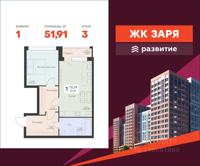 В продаже квартира площадью 51.91 кв. м с черновой отделкой. Квартира расположена на 3 этаже 16 этажного дома, в новом жилом комплексе "Заря" от федерального застройщика "Развитие". Жилой Комплекс "Заря" - это стильный, комфортный и современный проект с уникальной для Воронежа инфраструктурой. Между зданиями уютно расположится приватный благоустроенный двор-патио - мини оазис с пешеходными дорожками. Все это дополняет отличная транспортная доступность, неординарная архитектура, множество эксклюзивных форматов жилья, собственный подземный паркинг на 240 мест. "Заря" - новый стандарт комфортной городской жизни. Расположение Пешком: - 5 минут до ТЦ "Европа"; - 6 минут до остановки "Улица Брусилова"; - 7 минут до ул. Ильича; - 10 мин. до Ленинского проспекта. На машине: - 3 мин. до Чернавского моста; - 5 мин. до СК "Чернавская дамба" - 6 мин. до парка "Алые паруса"; - 7-10 минут до центра города и Петровской набережной. Благоустройство - стильное лобби с авторским дизайном; - теплая зона ожидания; - вместительные колясочные и велосипедные помещения; - лифты с доступом в паркинг; - кладовые на каждом этаже; - приватный двор-патио; - камерные лаунж-зоны в окружении зелени; - большое разнообразие растений: клены, ивы, можжевельник, китайская сирень и другие; - умное зонирование: тихие и шумные площадки удалены друг от друга; - беговые, прогулочные, велосипедные дорожки; - площадки для малышей и подростков; - спортивные корты и тренажеры; - общественный променад с ритейлом; - собственный деловой центр; - кафе, творческие студии, спортивные секции и магазины прямо на первом этаже дома. Окружение - места для прогулок: парк Патриотов, парк и пляж "Алые Паруса", сквер Ильича, бульвар "Ленинский проспект" у Воронежского водохранилища; - активный отдых: яхт-клуб, Центральный стадион, спорткомплекс Platinum Arena, фитнес-центр "Олимп" с бассейном; - все нужное рядом: ТЦ "Европа", школы и детские сады, поликлиника, центр педиатрии; - близость к центру: Центральный парк, Воронежский концертный зал, здание Управления ЮВЖД, Благовещенский собор.