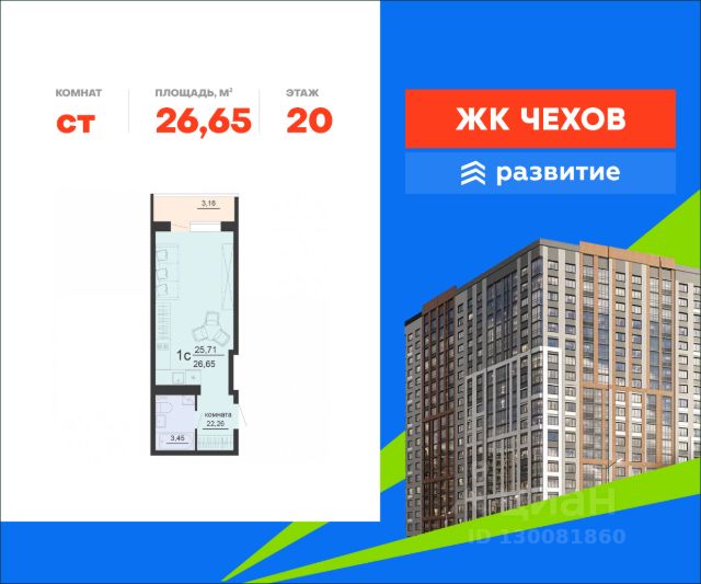 Продается квартира площадью 23.04 кв. м без отделки. Квартира находится на 20 этаже 20 этажного дома, в жилом комплексе "Чехов". Комплекс расположен по адресу - г. Воронеж, ул. Богдана Хмельницкого д. 45а. ЖК "Чехов" - новый проект ГК "Развитие" в Железнодорожном районе. Это современный жилой дом, состоящий из 4 секций с закрытым от шума собственным двором-"полумесяцем", где будет безопасно отпустить ребенка на прогулку и оставить автомобиль на ночь. Это проект для тех, кто ценит удобство и функциональность жилья, кто хочет получить максимальный комфорт за разумную цену. Расположение Пешком: - 4 мин. до автобусной остановки "Мебель Черноземья"; - 15 мин. до Суворовского затона; - 20 мин. до пляжа у Воронежского водохранилища. На автомобиле: - 2 мин. до Ленинского проспекта; - 5 мин. до ж/д станции "Отрожка"; - 15 мин. до центра города; - 20 мин. до вокзала "Воронеж-Южный". Благоустройство - большой озелененный двор; - умное зонирование; - взрослые деревья и живые цветы; - площадки для детей всех возрастов; - развивающий комплекс для самых маленьких; - зоны для фотосессий, особенно интересные подросткам; - спортивные конструкции и тренажеры; - безопасное покрытие на активных площадках; - собственный вишневый сад; - прогулочные и велосипедные дорожки; - отдельная стоянка для машин; - ритейл на первых этажах: рестораны, продуктовые лавки, службы быта. Окружение - 10 образовательных учреждений: школы, детские сады, колледжи, ВУЗы; - торгово-развлекательные центры "Максимир", "Лазурный", "Depo"; - 3 фитнес-центра, гребная база и стадион "Локомотив"; - пляж у Голубого озера, Репнинский лес, Центральный парк, Помологический сад ВГАУ и множество других парковых зон в центре города.