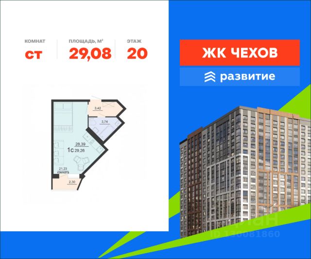 Продается квартира площадью 19.27 кв. м без отделки. Квартира находится на 20 этаже 20 этажного дома, в жилом комплексе "Чехов". Комплекс расположен по адресу - г. Воронеж, ул. Богдана Хмельницкого д. 45а. ЖК "Чехов" - новый проект ГК "Развитие" в Железнодорожном районе. Это современный жилой дом, состоящий из 4 секций с закрытым от шума собственным двором-"полумесяцем", где будет безопасно отпустить ребенка на прогулку и оставить автомобиль на ночь. Это проект для тех, кто ценит удобство и функциональность жилья, кто хочет получить максимальный комфорт за разумную цену. Расположение Пешком: - 4 мин. до автобусной остановки "Мебель Черноземья"; - 15 мин. до Суворовского затона; - 20 мин. до пляжа у Воронежского водохранилища. На автомобиле: - 2 мин. до Ленинского проспекта; - 5 мин. до ж/д станции "Отрожка"; - 15 мин. до центра города; - 20 мин. до вокзала "Воронеж-Южный". Благоустройство - большой озелененный двор; - умное зонирование; - взрослые деревья и живые цветы; - площадки для детей всех возрастов; - развивающий комплекс для самых маленьких; - зоны для фотосессий, особенно интересные подросткам; - спортивные конструкции и тренажеры; - безопасное покрытие на активных площадках; - собственный вишневый сад; - прогулочные и велосипедные дорожки; - отдельная стоянка для машин; - ритейл на первых этажах: рестораны, продуктовые лавки, службы быта. Окружение - 10 образовательных учреждений: школы, детские сады, колледжи, ВУЗы; - торгово-развлекательные центры "Максимир", "Лазурный", "Depo"; - 3 фитнес-центра, гребная база и стадион "Локомотив"; - пляж у Голубого озера, Репнинский лес, Центральный парк, Помологический сад ВГАУ и множество других парковых зон в центре города.