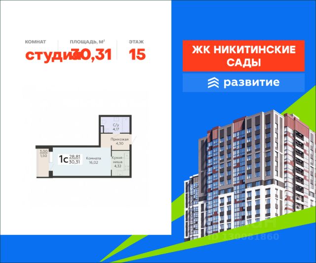В продаже квартира площадью 30.64 кв. м с черновой отделкой. Квартира расположена на 13 этаже 20 этажного дома, в жилом комплексе комфорт-класса "Никитинские сады". "Никитинские сады" - это новое пространство, которое объединяет в себе современный внешний вид и атмосферу природного уюта. Жилой комплекс включает в себя 4 20-этажных корпуса, 1090 квартир различных планировок, множество общественных пространств для отдыха и собственную инфраструктуру. Наслаждайтесь всеми преимуществами города в окружении живописной природы! Расположение - 10 мин. пешком до остановки "улица Маршала Голикова"; - 5 мин. до бульвара Победы; - 9 мин. до ТРЦ "Арена"; - 20 мин. до ж/д станции "Березовая роща"; - 25 мин. до центра города; Благоустройство - несколько садов во дворе; - озеленение территории; - развивающие комплексы для малышей; - зоны для фотосессий; - скамьи по всему периметру; - прогулочные дорожки; - уличные тренажеры; - турники для воркаута; - мягкое покрытие на активных площадках; - оборудование из натуральных материалов; - освещение территории в вечерние часы; - просторный наземный паркинг; - кафе, магазины и бытовые сервисы на первых этажах. Окружение - природный отдых: Северный лес и лесопарк, пляж у реки Дон, озера Северск, Бычок, Круглое; - активный отдых: спорткомплекс "Арена Север", "Олимпик", футбольная школа и стадион, бассейн "Атлант", теннисный клуб "Спарта"; - культурный отдых: Музей почтового дела, КДЦ "Северный", храм Ксении Петербургской; - городской отдых: ТРЦ Сити-парк "Град" и "Московский проспект", ТРЦ "Арена", множество магазинов, кафе и студий красоты.