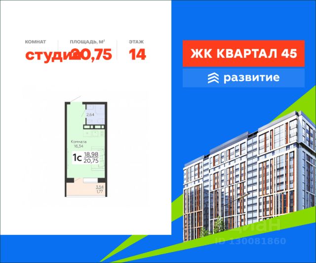 В продаже квартира площадью 20.75 кв. м с черновой отделкой отделкой. Квартира расположена на 14 этаже 18 этажного дома, в жилом комплексе комфорт-класса "Квартал 45". "Квартал 45" - это амбициозный проект будущего сердца Московского проспекта, в котором объединены лучшие градостроительные традиции, уникальная архитектура и современные технологии дизайна. Удачная локация рядом с центром, функциональные планировки, приватный парк в шаге от дома, собственный подземный паркинг на 187 машино-мест. Проект от девелопера "Развитие" сочетает в себе все преимущества современного комфортного жилья. Расположение Пешком: - 3 мин. до остановки "Московский проспект"; - 5 мин. до Центрального автовокзала; - 15 мин. до уютного Коминтерновского сквера. На автомобиле: - 10 мин. до центра Воронежа; - 10 мин. до Ботанического сада; - 15 мин. до Петровской набережной. Благоустройство - приватный двор для жителей; - безопасность: нет машин, работают видеокамеры; - много зелени: деревья, кустарники, газоны; - тихие места для отдыха на свежем воздухе; - спортивный корт для командных игр; - силовые тренажеры и турники; - игровой городок для детей всех возрастов; - лужайки для пикников; - велосипедные и беговые дорожки; - длинный прогулочный бульвар; - просторный холл с авторским дизайном; - 2 лифта в каждом подъезде - грузовой и пассажирский; - удобные зоны хранения колясок и спортивного инвентаря; - кафе, продуктовые магазины, салоны красоты и другая инфраструктура на первом этаже дома. Окружение - 5 парков в пределах 10 минут: Центральный парк, Ботанический сад ВГУ, Лесопарковый участок НИИЛГиС, парк Победы, Северный лес; - спорткомплекс и стадион "Динамо", "Арена Север", Центральный стадион профсоюзов; - детская и взрослая областная больница, несколько частных клиник; - ТРЦ "Московский проспект", ТЦ "Москва", множество сетевых супермаркетов. Квартира-студия на улице 45-й Стрелковой Дивизии в городе Воронеж.
