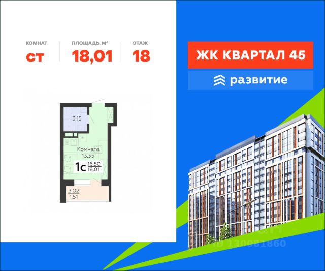 В продаже квартира площадью 20.75 кв. м с черновой отделкой. Квартира расположена на 14 этаже 18 этажного дома, в жилом комплексе комфорт-класса "Квартал 45". "Квартал 45" - это амбициозный проект будущего сердца Московского проспекта, в котором объединены лучшие градостроительные традиции, уникальная архитектура и современные технологии дизайна. Удачная локация рядом с центром, функциональные планировки, приватный парк в шаге от дома, собственный подземный паркинг на 187 машино-мест. Проект от федерального застройщика "Развитие" сочетает в себе все преимущества современного комфортного жилья. Расположение Пешком: - 3 мин. до остановки "Московский проспект"; - 5 мин. до Центрального автовокзала; - 15 мин. до уютного Коминтерновского сквера. На автомобиле: - 10 мин. до центра Воронежа; - 10 мин. до Ботанического сада; - 15 мин. до Петровской набережной. Благоустройство - приватный двор для жителей; - безопасность: нет машин, работают видеокамеры; - много зелени: деревья, кустарники, газоны; - тихие места для отдыха на свежем воздухе; - спортивный корт для командных игр; - силовые тренажеры и турники; - игровой городок для детей всех возрастов; - лужайки для пикников; - велосипедные и беговые дорожки; - длинный прогулочный бульвар; - просторный холл с авторским дизайном; - 2 лифта в каждом подъезде - грузовой и пассажирский; - удобные зоны хранения колясок и спортивного инвентаря; - кафе, продуктовые магазины, салоны красоты и другая инфраструктура на первом этаже дома. Окружение - 5 парков в пределах 10 минут: Центральный парк, Ботанический сад ВГУ, Лесопарковый участок НИИЛГиС, парк Победы, Северный лес; - спорткомплекс и стадион "Динамо", "Арена Север", Центральный стадион профсоюзов; - детская и взрослая областная больница, несколько частных клиник; - ТРЦ "Московский проспект", ТЦ "Москва", множество сетевых супермаркетов.