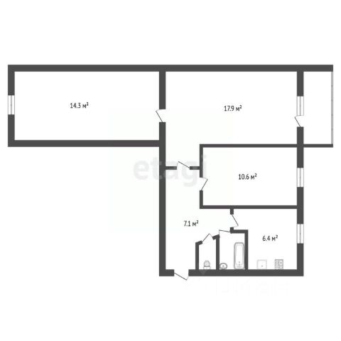 Общая площадь 73.9 кв.м (кухня, совмещенная с балконом 17 кв.м; комнаты 15.81 кв.м, 14.05 кв.м, 13,45 кв.м);