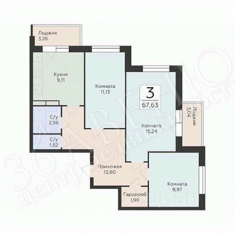 Общая 60,39 кв.м Спальни 14,59/ 15,74 кв.м Большая Кухня 11,75 кв.м