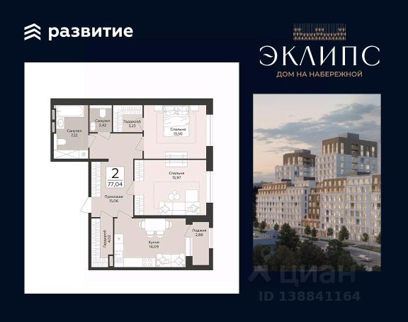 Продаётся 1-комнатная квартира в строящемся доме (Эклипс), срок сдачи: III-кв. 2030, общей площадью 42.69 кв.м., на 3 этаже. Новый жилой комплекс от группы компаний "Развитие" расположен по адресу: г. Воронеж, набережная Массалитинова.