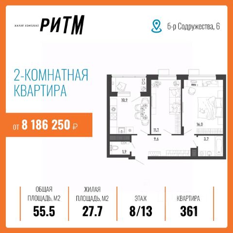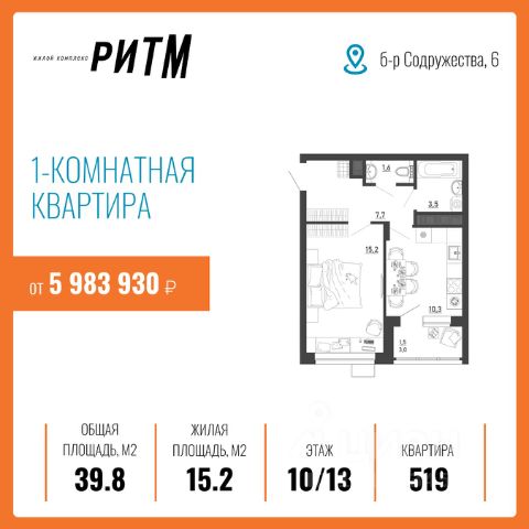 ЖК "РИТМ" — ДОСТУПНАЯ И ВЫГОДНАЯ ИНВЕСТИЦИЯ В ВАШЕ БУДУЩЕЕ Жилой комплекс "Ритм" по ул. Бульвар Содружества уч. 6 — часть масштабного проекта развития территории воронежского левобережья — микрорайона "Ключи", который займет 28,6 га недалеко от въезда в город по тамбовскому направлению. Здесь строится инновационный красивый мини-город. Он насыщен социальной и коммерческой инфраструктурой и обеспечен новейшими коммуникациями. Комплекс состоит не только из качественных домов. Решения по благоустройству стимулируют ведение активного здорового образа жизни. Продуманы возможности для взаимодействия людей, их творческой самореализации, выстраивания добрососедских связей и формирования современного приятного комьюнити. И все это на благоприятном экологическом фоне. Это действительно новый шаг в создании привлекательной среды для жизни в современном ритме! Жить, не ограничивая себя и свою семью, — разве не об этом вы мечтали? Вас ждет инновационное пространство, где вы будете вести свою насыщенную и интересную жизнь в выбранном вами ритме. Подземный паркинг на -1 этаже вместимостью на 114 машино-места, в том числе семейные парковки на два автомобиля освобождает двор от машин — там гораздо приятнее гулять с детьми или заниматься спортом. Жители смогут выходить к своему автомобилю в теплый паркинг прямо из лифта — нет беспокойства из-за погодных условий или за сохранность транспортного средства. Ваши гости тоже не останутся без парковки — на придомовой территории организовано - 131 место и вне придомовой территории - 213 мест. Для абсолютного комфорта на -1 этаже в каждой секции расположены кладовые помещение площадью от 2,10 до 5,0 кв.м., где можно хранить все что угодно — велосипеды, санки, лыжи и прочие вещи. Они больше не будут занимать весь балкон. Там гораздо приятнее пить кофе и любоваться видом из окна. ИНФРАСТРУКТУРА и ПРЕИМУЩЕСТВА Инновационное жилье в ЖК "Ритм" совсем рядом — 5 минут до Остужевского кольца, 20 минут до центра, рядом новая транспортная развязка. Легко добраться до работы и вузов, на концерт или в гости. Первый цифровой квартал в городе Дворы без машин Подземный паркинг и кладовые (в каждой секции) Сервисная Управляющая Компания (Smile) Новая инфраструктура района и коммуникаций Рядом с вами: новая уже действующая школа - 3 минут (просто перейти дорогу) новый детский сад (проект на стадии разработки, ориентировочный срок сдачи конец 2026 года) - 5 минут (просто перейти дорогу) 5 минут от центральной площади событий и прогулочных аллей стадион и спортивные площадки поликлиника (проект на стадии разработки) магазины аптеки детские площадки