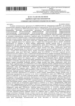 Земельный участок площадью 6801 кв. м, кадастровый номер 31:05:0509007:37. Имущество обременено: арест, запрещение регистрации. Имущество принадлежит на праве собственности Гречка А.Н. Основание реализации: постановление о пере...