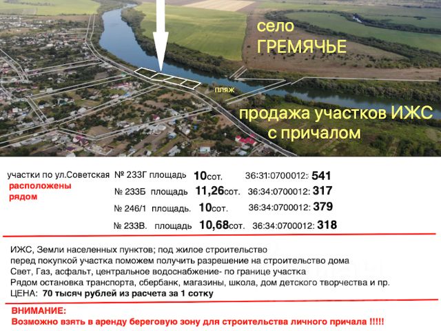 Продам участок в селе Гремячье Хохольский р-он Воронежская область; ул. Советская уч.233Г или уч. 233-Б; или уч.246/1; или уч.233-В----------- по желанию от Воронежа примерно 20 км от ул.проспект Патриотов; Коммуникации по границе участка (газ, электричество, центральное водоснабжение) Земли населенных пунктов; ИЖС; Разрешено капитальное строительство; Поможем получить разрешение на строительство перед покупкой участка Прекрасный вид на реку ДОН. Высокий не затапливаемый берег; Соблюдены санитарные нормы отступа от береговой зоны реки ДОН. Возможно построить собственный причал на береговой зоне Стоимость 70 тысяч рублей из расчета за 1 сотку Прямая продажа от собственника