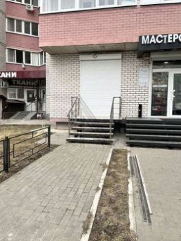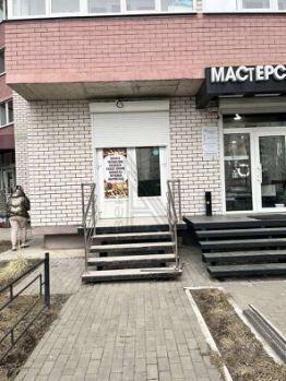 Место под вывеску.Есть парковка для посетителей. Дом новый, район заселенный, много соседних построек.