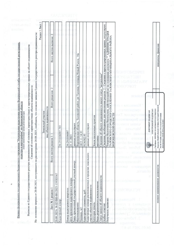 Земельный участок с кадастровым номером 36:29:0106007:703 площадь 1815 по адресу Воронежская область, Таловский район, рп Таловая, площадь Новый Рынок, 14а