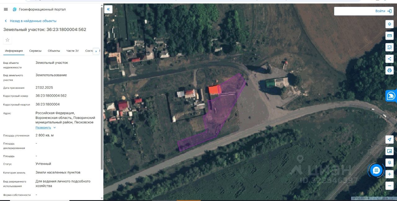 Данные получены с сайта ГИС Торги. Земельный участок с кадастровым номером 36:23:1800004:562 площадь 2800 по адресу Российская Федерация, Воронежская область, Поворинский муниципальный район, Песковское сельское поселение, село Пески, ул. Первомайская, 1б