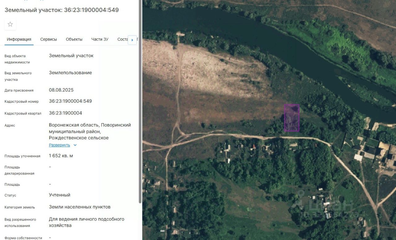 Земельный участок с кадастровым номером 36:23:1900004:549 площадь 1652 по адресу Воронежская область, Поворинский муниципальный район, Рождественское сельское поселение, с. Рождественское, ул Рыбацкая, 30в