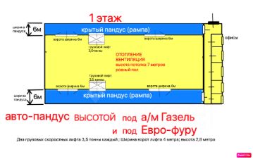 Крытая авто-рампа расположена зеркально вокруг склада. Возможна одновременная разгрузка до 5 авто сразу. Потолок в складе 7 метров, ровный бетонный пол для рохли