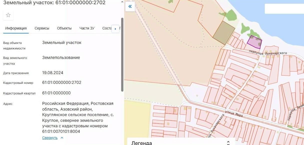 земельный участок площадью 4 069 кв. м, с кадастровым номером 61:01:0000000:2702, из категории земель "Земли населенных пунктов", с видом разрешенного использования "отдых (рекреация)", расположенного по адресу: Российская Федерация, Ростовская обл, Азовский район, Круглянское сельское поселение, с. Круглое, севернее земельного участка с кадастровым номером 61:01:0070101:8004