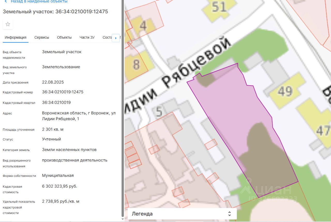 Земельный участок, находящийся по адресу: Воронежская область, г. Воронеж, ул. Лидии Рябцевой, 1, категории земель: земли населенных пунктов, вид разрешенного использования: производственная деятельность, площадь земельного участка: 2 301 кв. м, кадастровый номер:36:34:0210019:12475