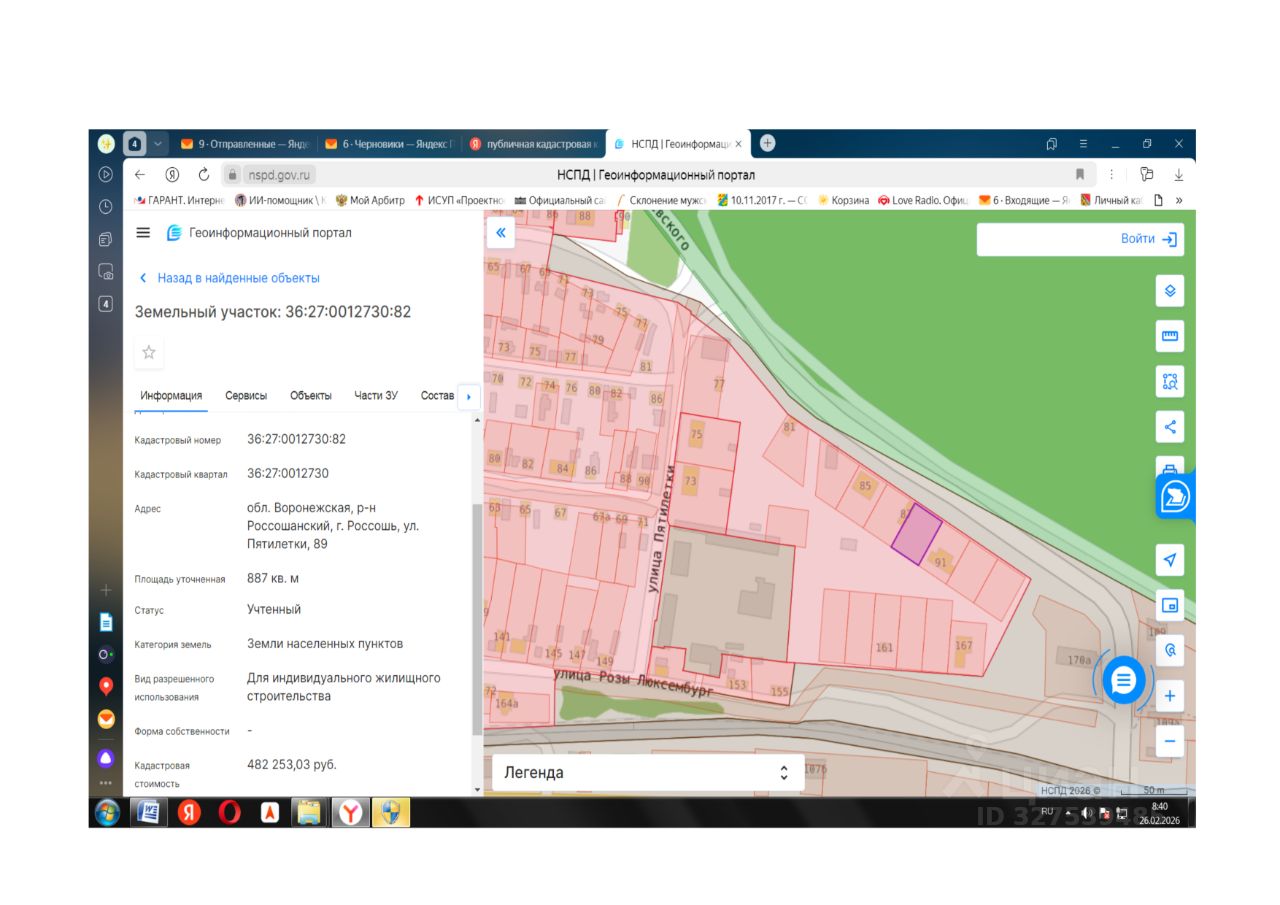 земельный участок с кадастровым номером 36:27:0012730:82, расположенный по адресу: обл. Воронежская, р-н Россошанский, г. Россошь, ул. Пятилетки, 89, площадью 887 кв.м, категории земель населенных пунктов, с видом разрешенного использования для индивидуального жилищного строительства