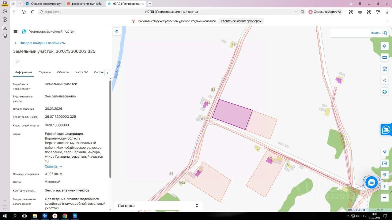 Земельный участок с кадастровым номером 36:07:3300003:325 площадь 3195 кв. м., расположенный по адресу: Воронежская область, Верхнехавский муниципальный район, Нижнебайгорское сельское поселение, с. Верхняя Байгора, ул. Гагарина, участок 1Б, разрешенное использование — для ведения личного подсобного хозяйства (приусадебный земельный участок), земельный участок относится к категории земель земли населённых пунктов, государственная собственность на который не разграничена.