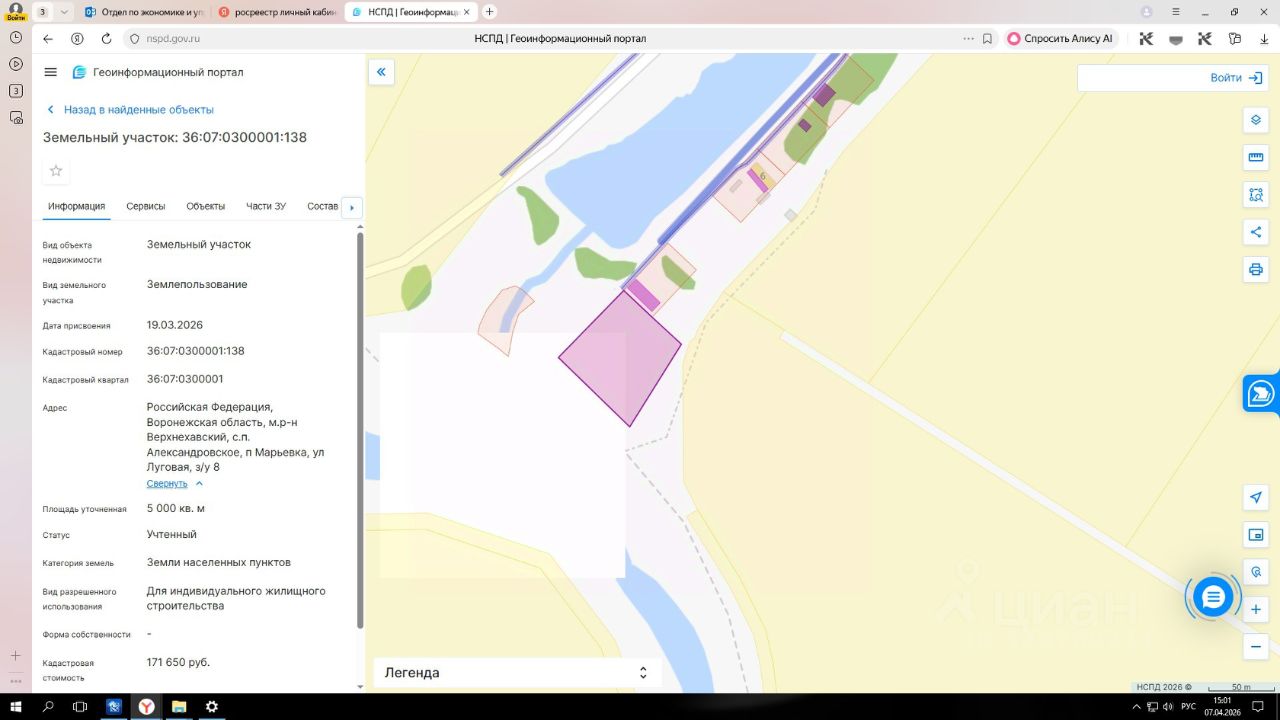 Земельный участок с кадастровым номером 36:07:0300001:138 площадь 5000 кв. м., расположенный по адресу: Воронежская область, Верхнехавский муниципальный район, Александровское сельское поселение, п. Марьевка, ул. Луговая, участок 8, разрешенное использование — для индивидуального жилищного строительства, земельный участок относится к категории земель земли населённых пунктов, государственная собственность на который не разграничена.