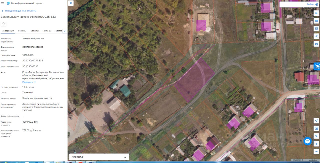 земельный участокиз земель населенных пунктов, общей площадью 1540 кв. м., кадастровый номер 36:10:1000035:333, расположенного по адресу: Российская Федерация, Воронежская область, Калачеевский муниципальный район, Заброденское сельское поселение, с. Заброды, ул. Заброденская, 87ж, разрешенное использование для ведения личного подсобного хозяйства (приусадебный земельный участок)