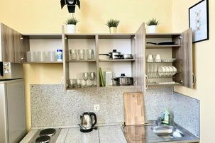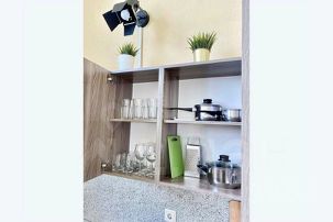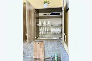 •Холодильник, СВЧ, электрический чайник, стиральная машинка-автомат, варочная панель, утюг, фен, гладильная доска, сушилка для белья ( чай,кофе,сахар,соль и тд. )