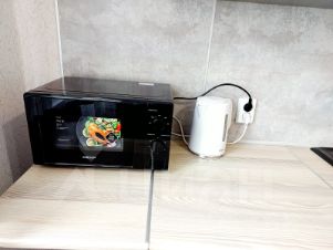 Бытовая техника: холодильник, стиральная машина, микроволновая печь, утюг с гладильной доской, электрический чайник, фен, вентилятор.