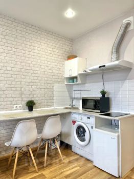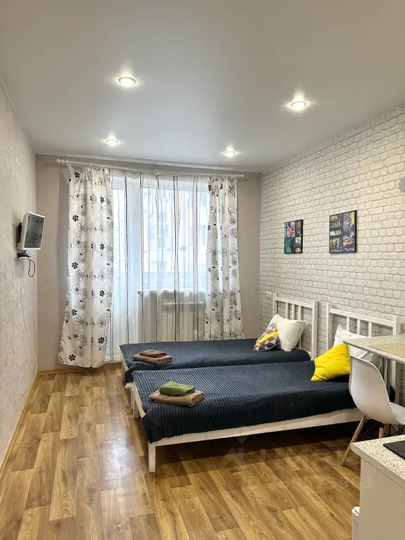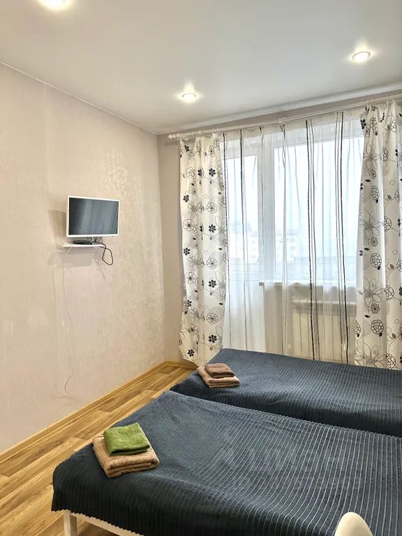 Квартира студия. 2 раздельных спальных места, можно сдвинуть кровати. Возможно 3 спальное место - раскладушка, по предварительному согласованию. Постельное белье, полотенца, посуда, чай, кофе, сахар предоставляются. Микроволновка, стиральная машина, утюг, телевизор. Wi-Fi.