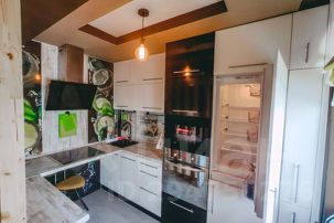 * Холодильник, микроволновая печь, электрический чайник, варочная панель, духовой шкаф, вытяжка.