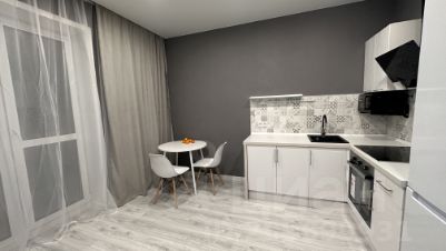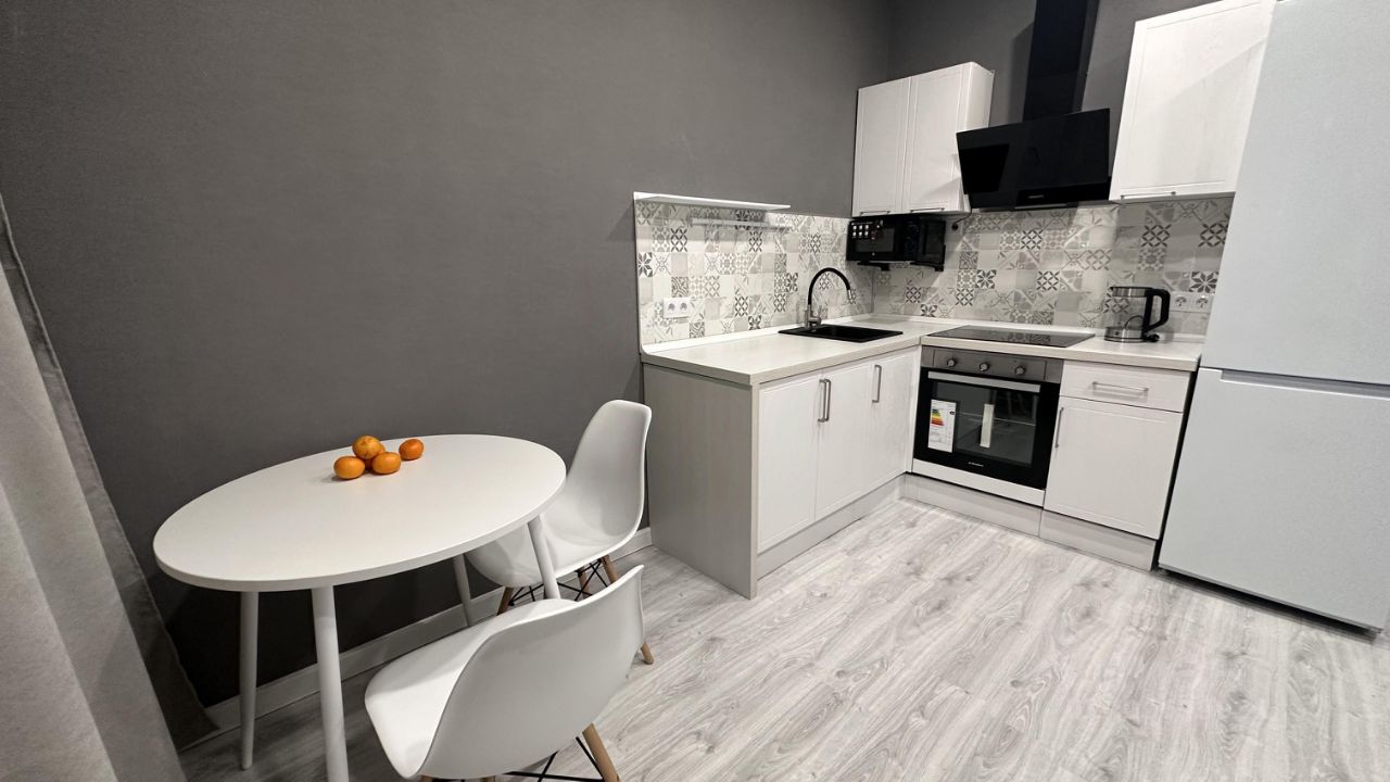 - Современная кухня с полноценной варочной панелью и духовым шкафом. Чайник и микроволновая печь. Большой холодильник. Стол, стулья.
