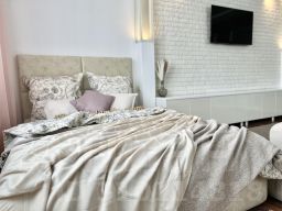 В апартаментах имеется бесплатный высокоскоростной WI-FI, чистое, свежее постельное бельё, посуда, столовые приборы, посуда для приготовления еды, большая ванная комната с массажным джакузи с подсветкой, полы с подогревом.