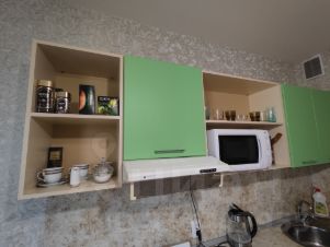 Полностью оборудованная кухня со всем необходимым наполнением (посуда и столовые приборы, чайник, плита, микроволновая печь, обеденная группа).
