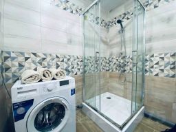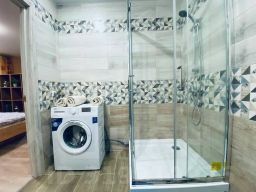 Спальные места: 2 двуспальные кровати, 2 двуспальных дивана, 1 раскладная кровать может быть предоставлена по запросу. На кухне: обеденная зона, микроволновая печь, чайник, холодильник. Совмещённый санузел, есть стиральная машина, фен, утюг, водонагреватель.