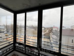 Теплая, застекленная лоджия, вид с которой открывается на стадион.