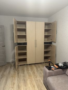 В комнате есть большой и мягкий диван, вместительный распашной шкаф и стенка-гостинная под большой телевизор.