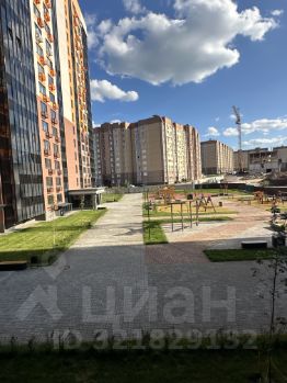 Окна балкона выходят во двор дома с видом на современную детскую площадку.