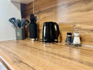 Кухня: полностью оборудована — холодильник, микроволновка, варочная панель, посудомоечная машина, чайник.