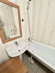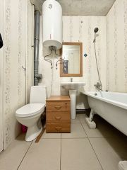 Санузел совмещен: унитаз, ванная, система водонагревания, стиральная машина, зеркало, умывальник.