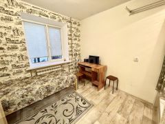 В квартире имеется просторная жилая комната, в которой установлены необходимая мебель и техника для комфортного проживания: телевизор, односпальная кровать, шкаф, стол рабочий.