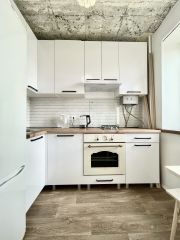 Также имеется отдельная кухня, оборудованная всей необходимой бытовой техникой и мебелью: газовая плита, электрический духовой шкаф, вытяжка, холодильник, кухонный гарнитур, стол, стулья.