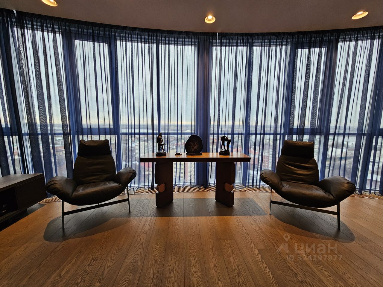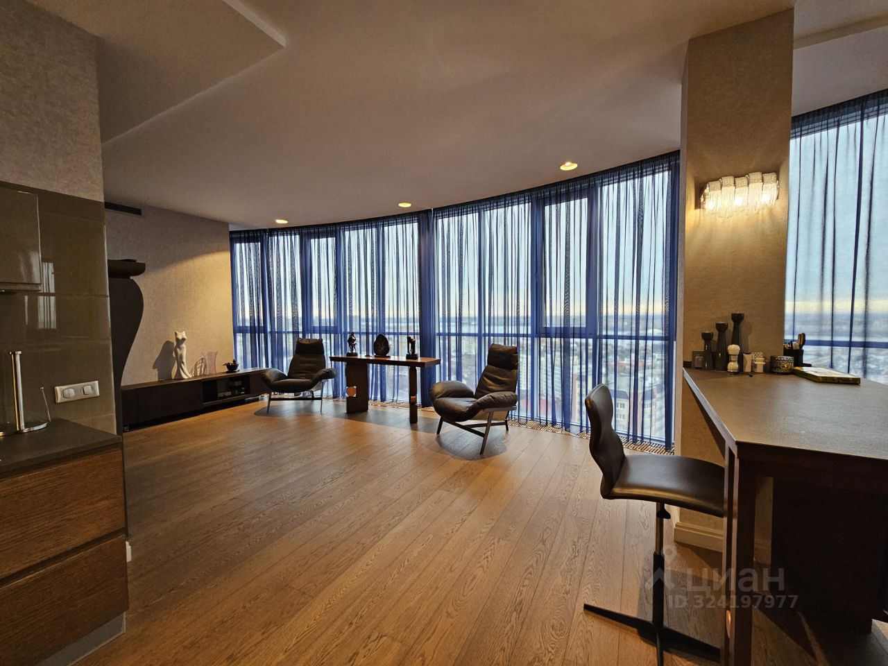 Квартира имеет большую кухню гостиную с витражными окнами на водохранилище и город, зонирована на кухню, барную стойку, место для отдыха, место для переговоров у телевизора, обеденную зону.