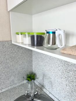 - Свч, стиральная машина, холодильник, эл. Плита-духовой шкаф, утюг, гладильная доска, сушилка, фен, набор посуды и столовых приборов